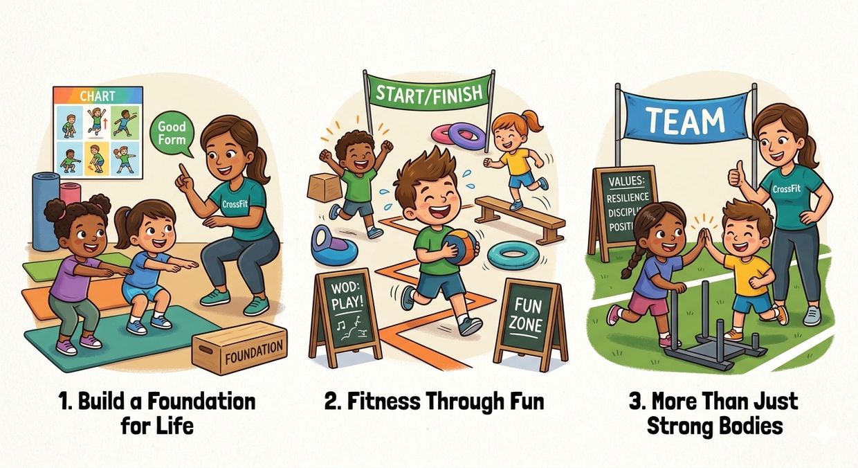 In our kids' classes, we focus on developing fundamental movement patterns—squatting, jumping, and pressing—in a safe and supportive environment. By mastering these basics early, children build the physical literacy and coordination needed for any sport or activity they choose to pursue as they grow.
